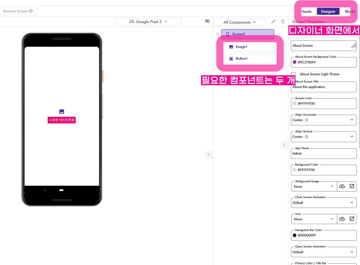이제 화면 디자인을 해볼까요? 컴포넌트를 끌어다 놓습니다. 이미지 하나와 버튼 하나만 있으면 됩니다. 왼쪽 컴포넌트 모음에서 찾아 핸드폰그림 위에다 끌어다 놓으세요.