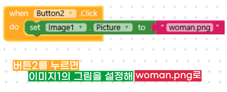 Button2는 여자라는 버튼이고요. 누르면 Image1의 그림이 woman.png로 나타나죠.