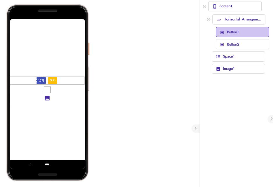 이 블록을 간단히 조합해서 아주 간단한 이런 앱을 만들 수 있어요. 남자 버튼을 누르면 남자 그림이 나오고, 여자 버튼을 누르면 여자 그림이 나오는 거죠.
