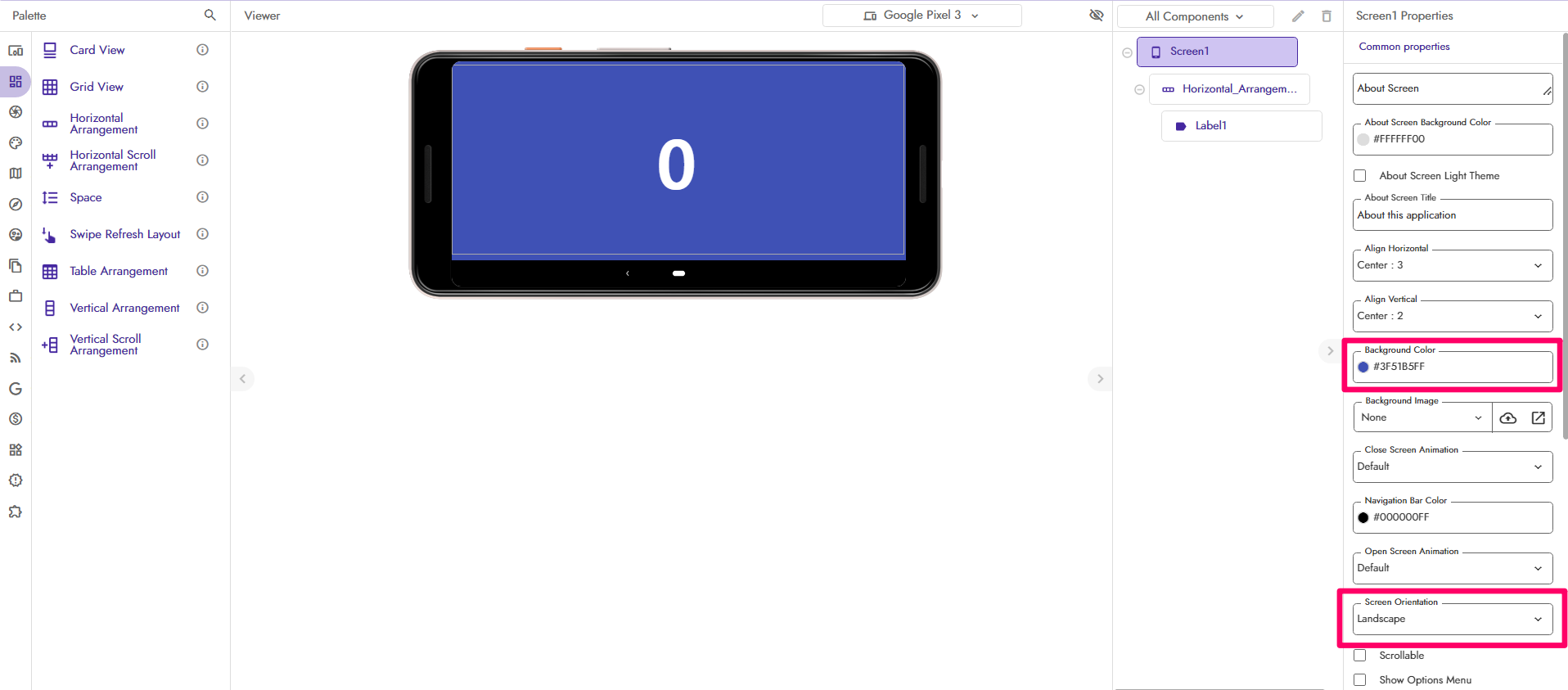 우측에서 Screen1을 선택한 상태에서 우측하단의 Screen Orientation을 찾아주세요. 그리고 그 값을 Landscape로 바꿔줍니다. 이는 화면을 가로로 넓게 쓰겠다는 의미랍니다.