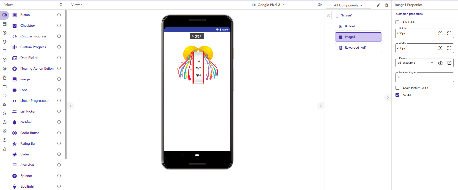 보상의 대상이 될 이미지를 하나 넣어줍니다. 이 이미지는 지금은 설명하느라 visible에 체크해두었지만, 실제로 빌드할 때는 visible을 해제해 줍니다. 광고를 제대로 다 보고 나서야 이용자가 이 이미지를 볼 수 있게 됩니다.