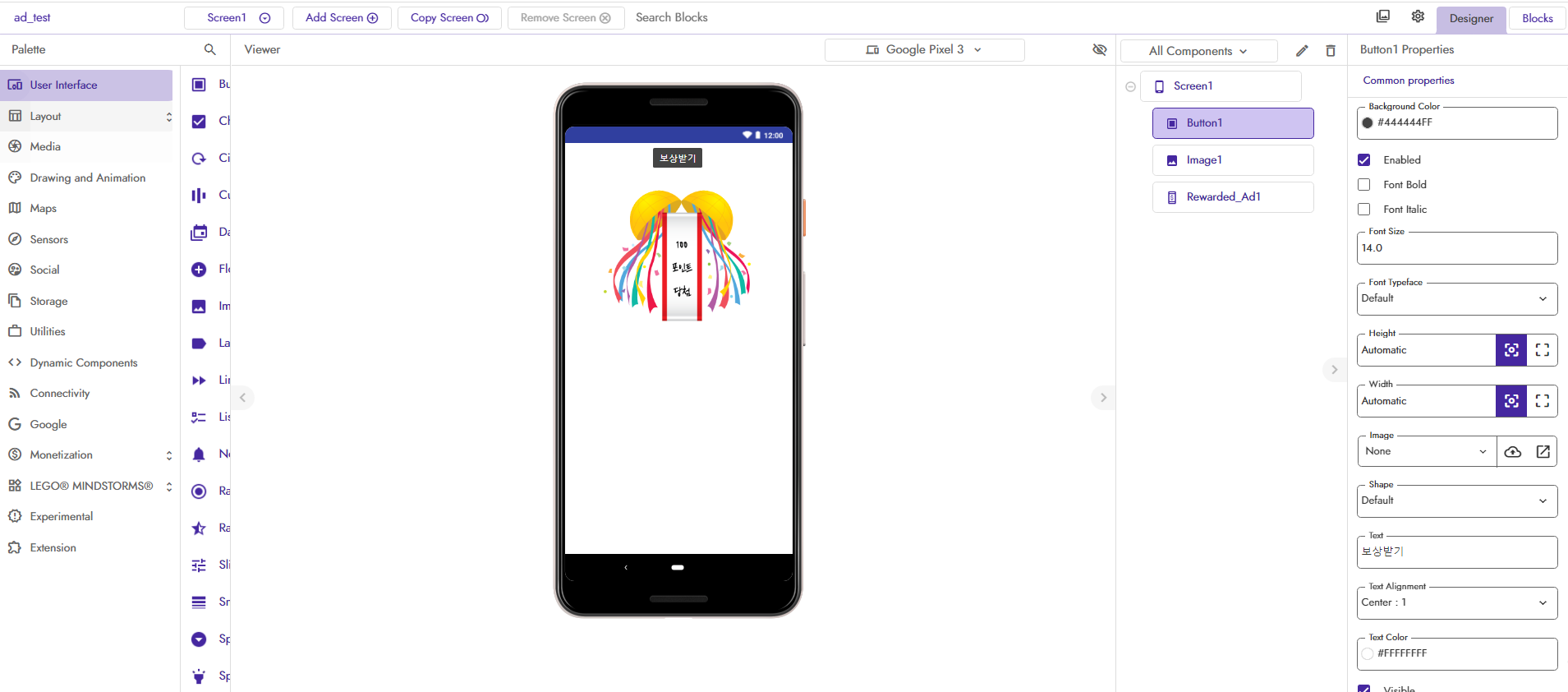 버튼을 하나 끌어다 놓고 버튼 이름을 보상받기라고 수정해줍니다. 이용자가 이 버튼을 누르면 광고가 뜨게 될 것입니다.
