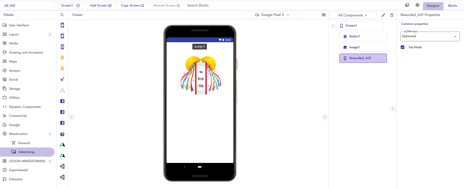 Monetization 메뉴의 Advertising 메뉴에서 Rewarded Ad를 끌어다 놓아줍니다.