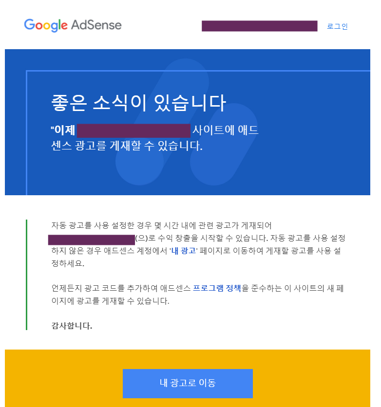 운영하던 블로그에 카카오 애드핏 수익이 거의 없다시피한 상황이다. 이젠 애드센스 광고를 달아보려고 사이트 신청했더니 하루정도 만에 답변이 왔다. 오잉 생각보다 빠른 답변! 😮