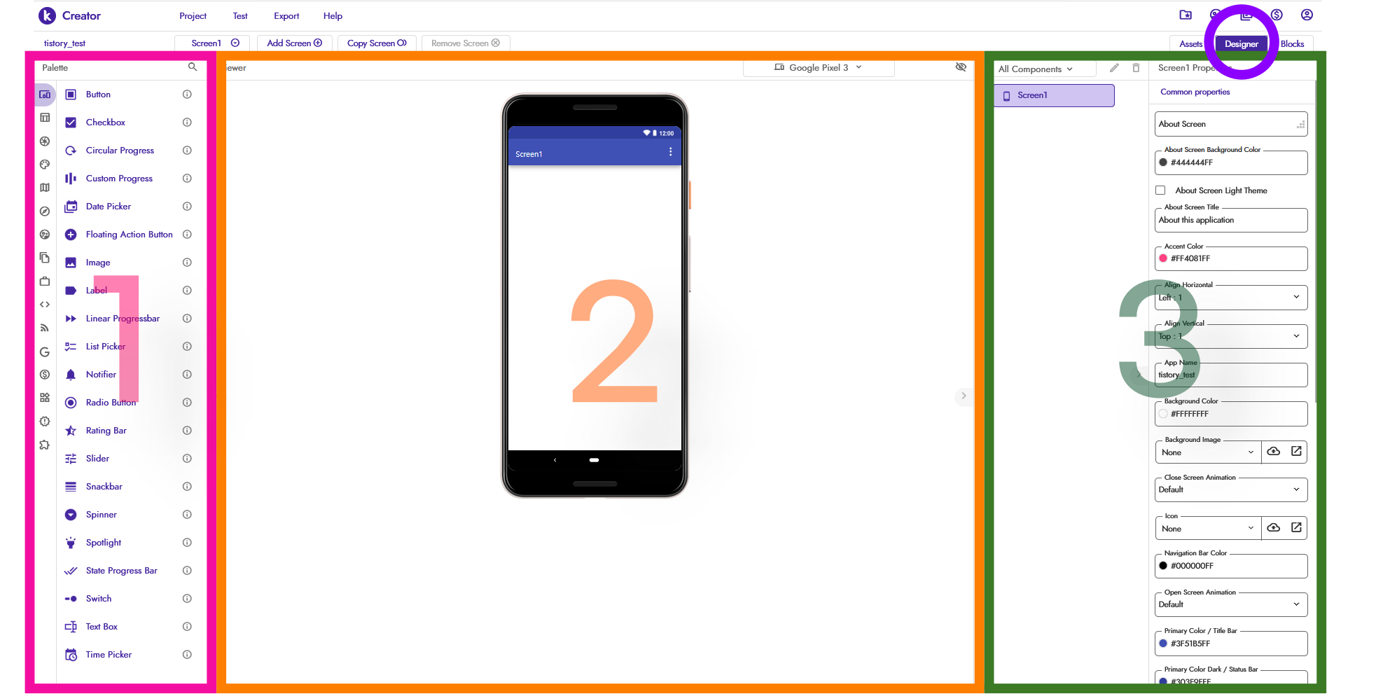 예를들어 버튼이 필요하다면 1에서 버튼을 끌어다가 2에 놓고 3에서 버튼색, 버튼크기 등 디자인과 관련된 것들을 설정하는 것이죠. 클릭할 때 나타날 동작들(ex. 버튼을 누르면 배경색을 바꿔라)은 여기서 하지 않아요. 다음에 살펴볼 Blocks(블록화면)에서 하는 것입니다.
