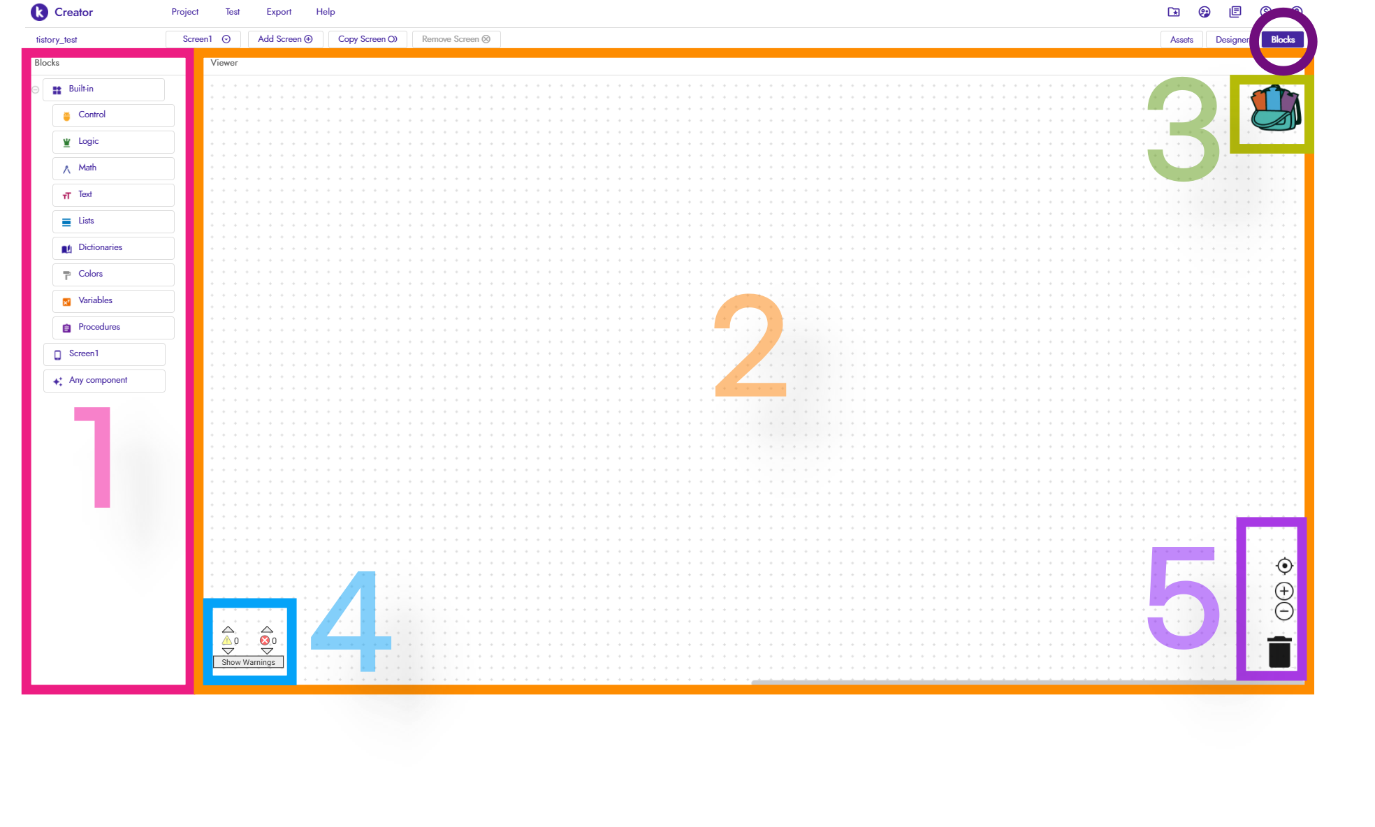 우측 상단 보라색 동그라미처럼 Blocks을 클릭하면, 코딩할 수 있는 화면이 나타납니다. 코딩화면은 크게 5개의 섹션으로 나뉩니다.