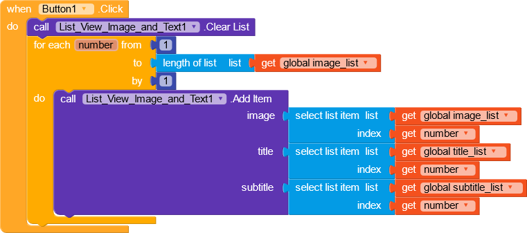 이번 시간에는 두번째 방법인 리스트뷰 이미지 앤드 텍스트를 사용하는 방법을 소개해보려고한다. 이름이 길어 복잡해보이지만, 말 그대로 '리스트로 보여주는 이미지와 글자' 라는 뜻이다. 이 블록을 사용하면 아래와 같은 리스트를 만들어낼 수 있다.