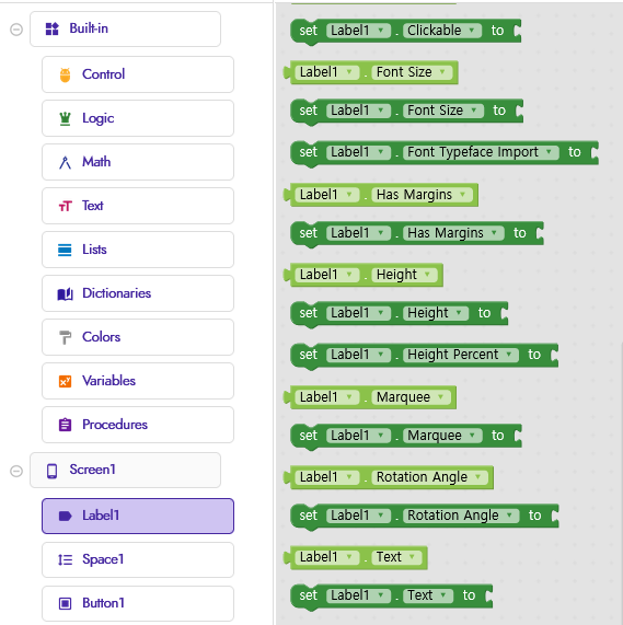 초록 블록은 Label1을 눌러서 찾으세요. 약간 아래쪽에 있어요.